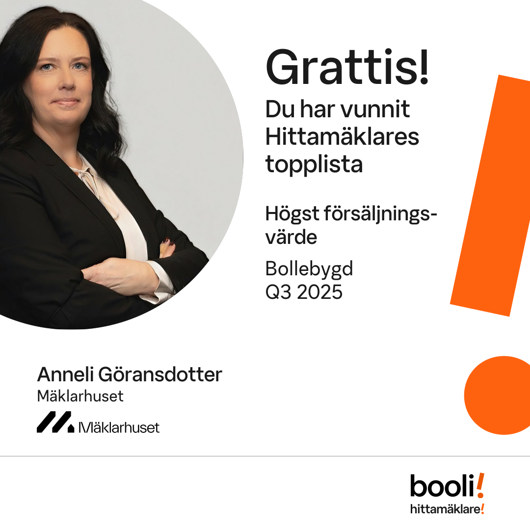 Statistik för publicerade bostäder, försäljningar och omdömen baseras på data från Booli och Hittamäklare. Statistiken för försäljningar avser inrapporterade och verifierade slutpriser från mäklare eller av Booli inhämtade och verifierade slutpriser. Statistiken för publicerade bostäder baseras på information som publicerats på Booli.se. Statistik för omdömen och rekommendationer baseras på omdömen från säljare som lämnats via Booli och Hittamäklare.