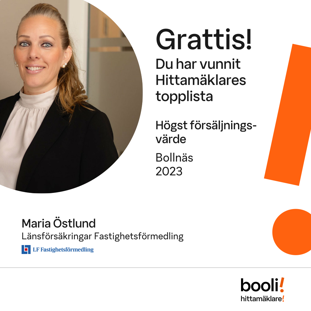 Statistik för publicerade bostäder, försäljningar och omdömen baseras på data från Booli och Hittamäklare. Statistiken för försäljningar avser inrapporterade och verifierade slutpriser från mäklare eller av Booli inhämtade och verifierade slutpriser. Statistiken för publicerade bostäder baseras på information som publicerats på Booli.se. Statistik för omdömen och rekommendationer baseras på omdömen från säljare som lämnats via Booli och Hittamäklare.