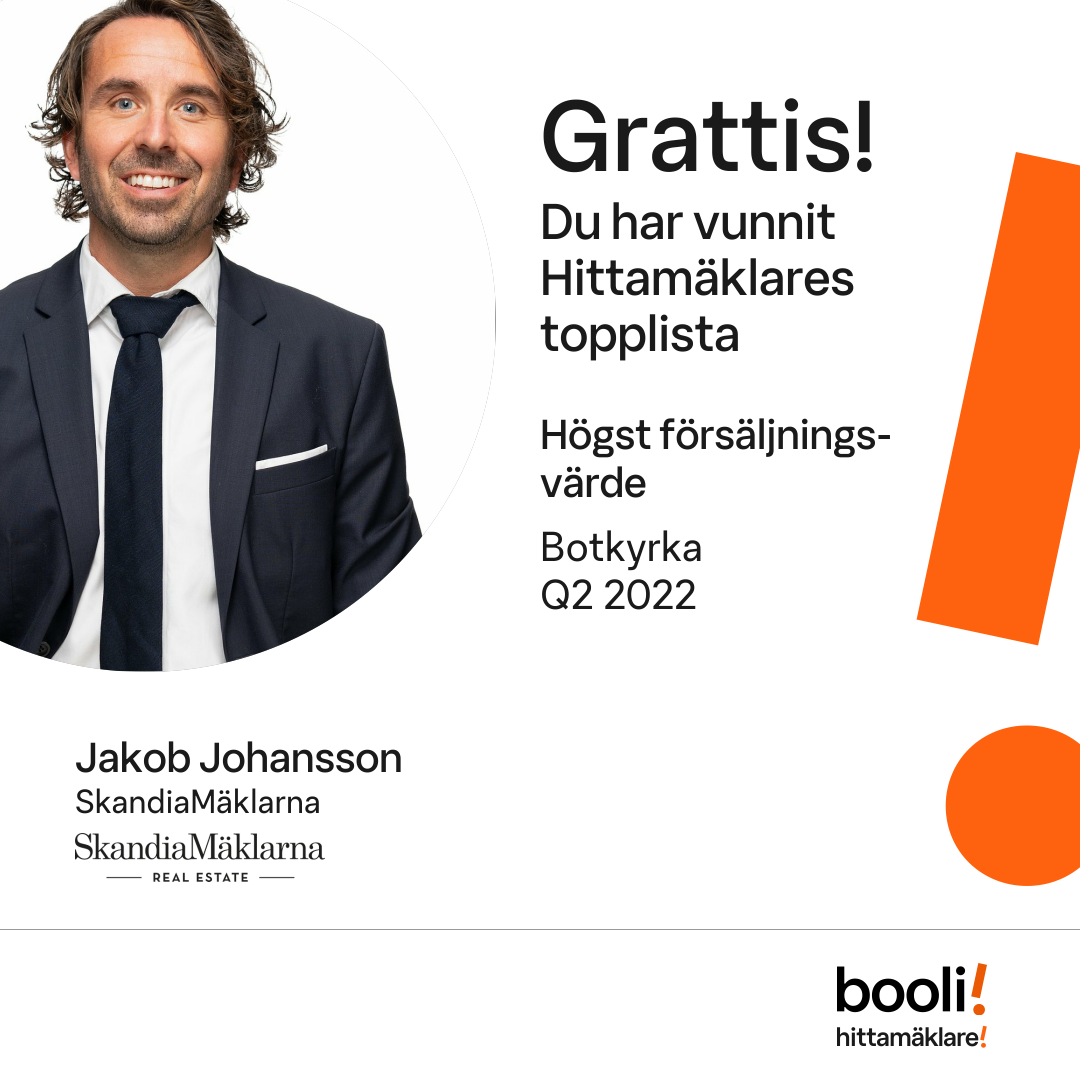 Statistik för publicerade bostäder, försäljningar och omdömen baseras på data från Booli och Hittamäklare. Statistiken för försäljningar avser inrapporterade och verifierade slutpriser från mäklare eller av Booli inhämtade och verifierade slutpriser. Statistiken för publicerade bostäder baseras på information som publicerats på Booli.se. Statistik för omdömen och rekommendationer baseras på omdömen från säljare som lämnats via Booli och Hittamäklare.