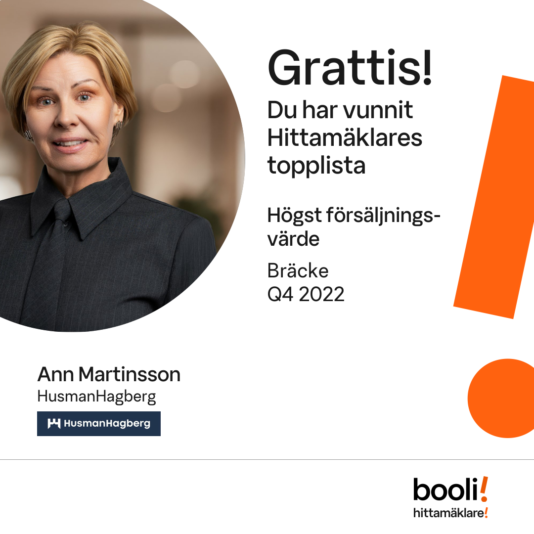 Statistik för publicerade bostäder, försäljningar och omdömen baseras på data från Booli och Hittamäklare. Statistiken för försäljningar avser inrapporterade och verifierade slutpriser från mäklare eller av Booli inhämtade och verifierade slutpriser. Statistiken för publicerade bostäder baseras på information som publicerats på Booli.se. Statistik för omdömen och rekommendationer baseras på omdömen från säljare som lämnats via Booli och Hittamäklare.