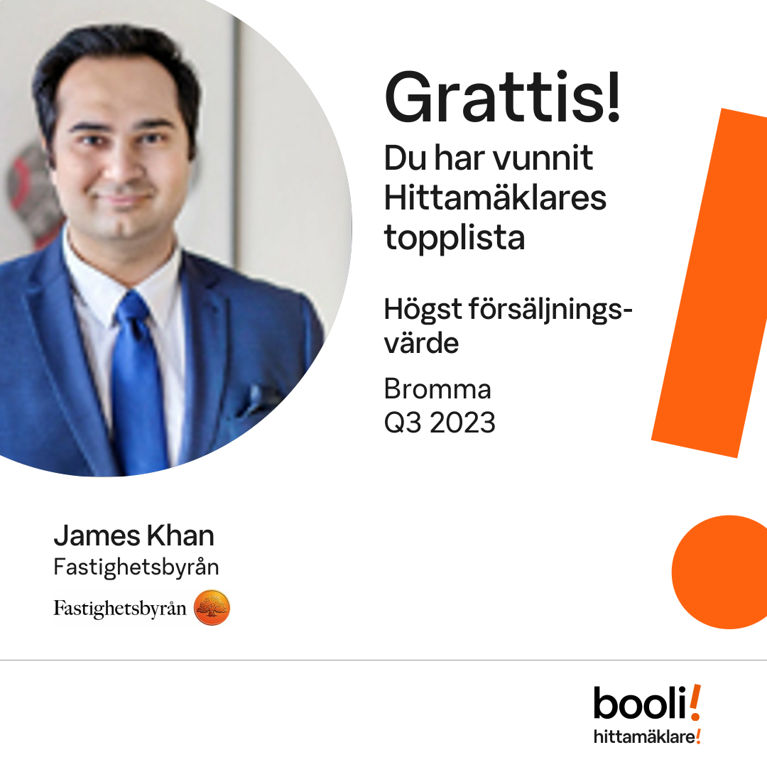 Statistik för publicerade bostäder, försäljningar och omdömen baseras på data från Booli och Hittamäklare. Statistiken för försäljningar avser inrapporterade och verifierade slutpriser från mäklare eller av Booli inhämtade och verifierade slutpriser. Statistiken för publicerade bostäder baseras på information som publicerats på Booli.se. Statistik för omdömen och rekommendationer baseras på omdömen från säljare som lämnats via Booli och Hittamäklare.