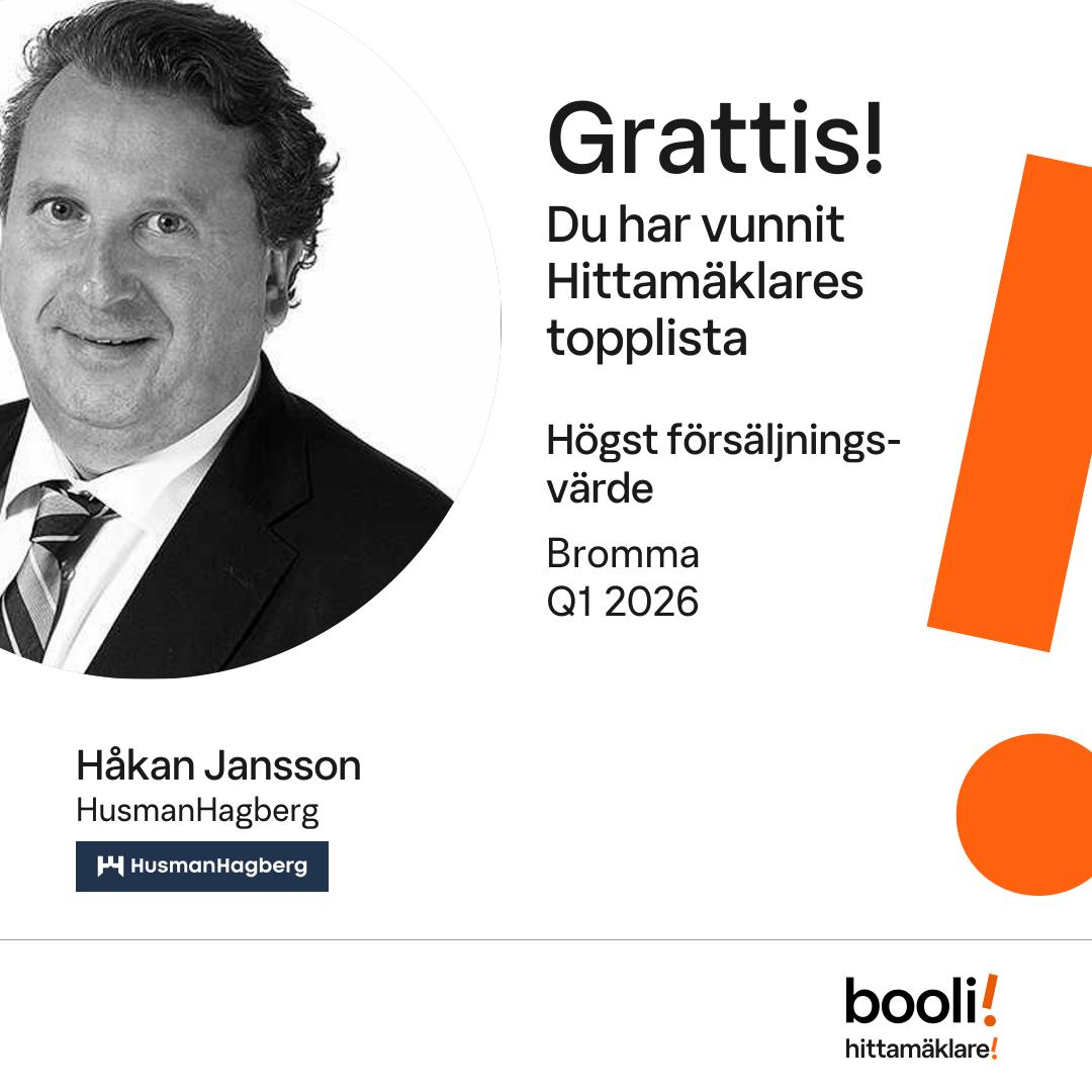 Statistik för publicerade bostäder, försäljningar och omdömen baseras på data från Booli och Hittamäklare. Statistiken för försäljningar avser inrapporterade och verifierade slutpriser från mäklare eller av Booli inhämtade och verifierade slutpriser. Statistiken för publicerade bostäder baseras på information som publicerats på Booli.se. Statistik för omdömen och rekommendationer baseras på omdömen från säljare som lämnats via Booli och Hittamäklare.