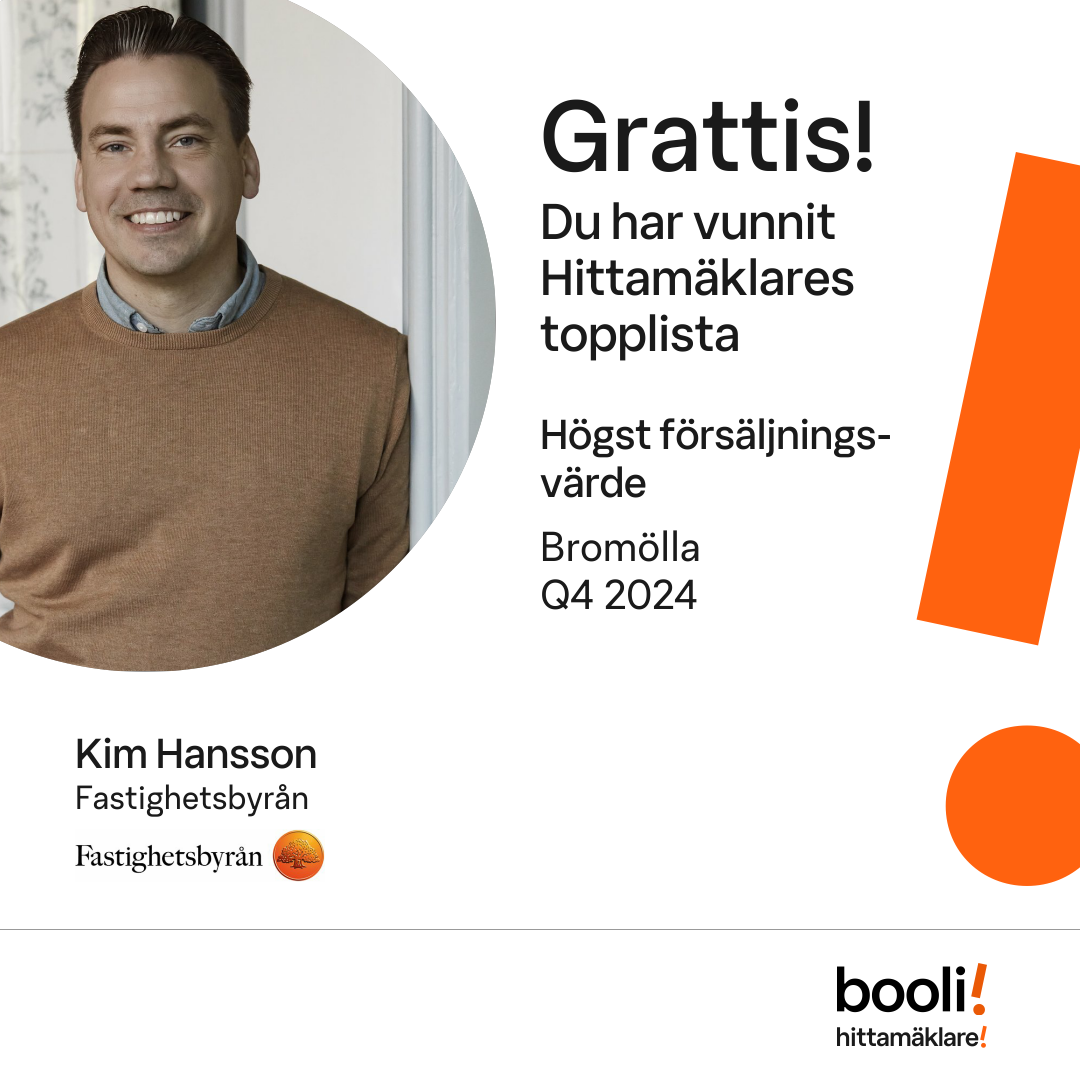 Statistik för publicerade bostäder, försäljningar och omdömen baseras på data från Booli och Hittamäklare. Statistiken för försäljningar avser inrapporterade och verifierade slutpriser från mäklare eller av Booli inhämtade och verifierade slutpriser. Statistiken för publicerade bostäder baseras på information som publicerats på Booli.se. Statistik för omdömen och rekommendationer baseras på omdömen från säljare som lämnats via Booli och Hittamäklare.