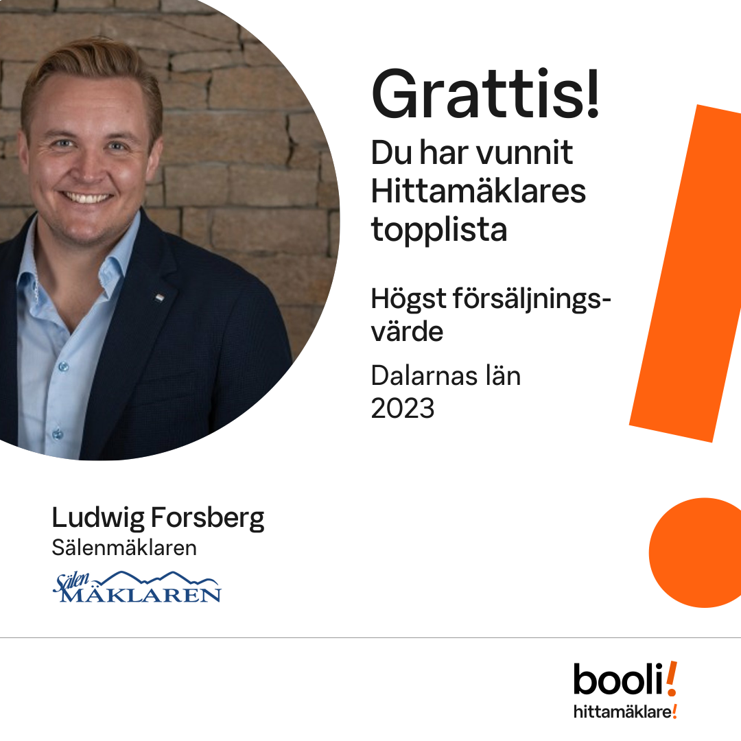 Statistik för publicerade bostäder, försäljningar och omdömen baseras på data från Booli och Hittamäklare. Statistiken för försäljningar avser inrapporterade och verifierade slutpriser från mäklare eller av Booli inhämtade och verifierade slutpriser. Statistiken för publicerade bostäder baseras på information som publicerats på Booli.se. Statistik för omdömen och rekommendationer baseras på omdömen från säljare som lämnats via Booli och Hittamäklare.