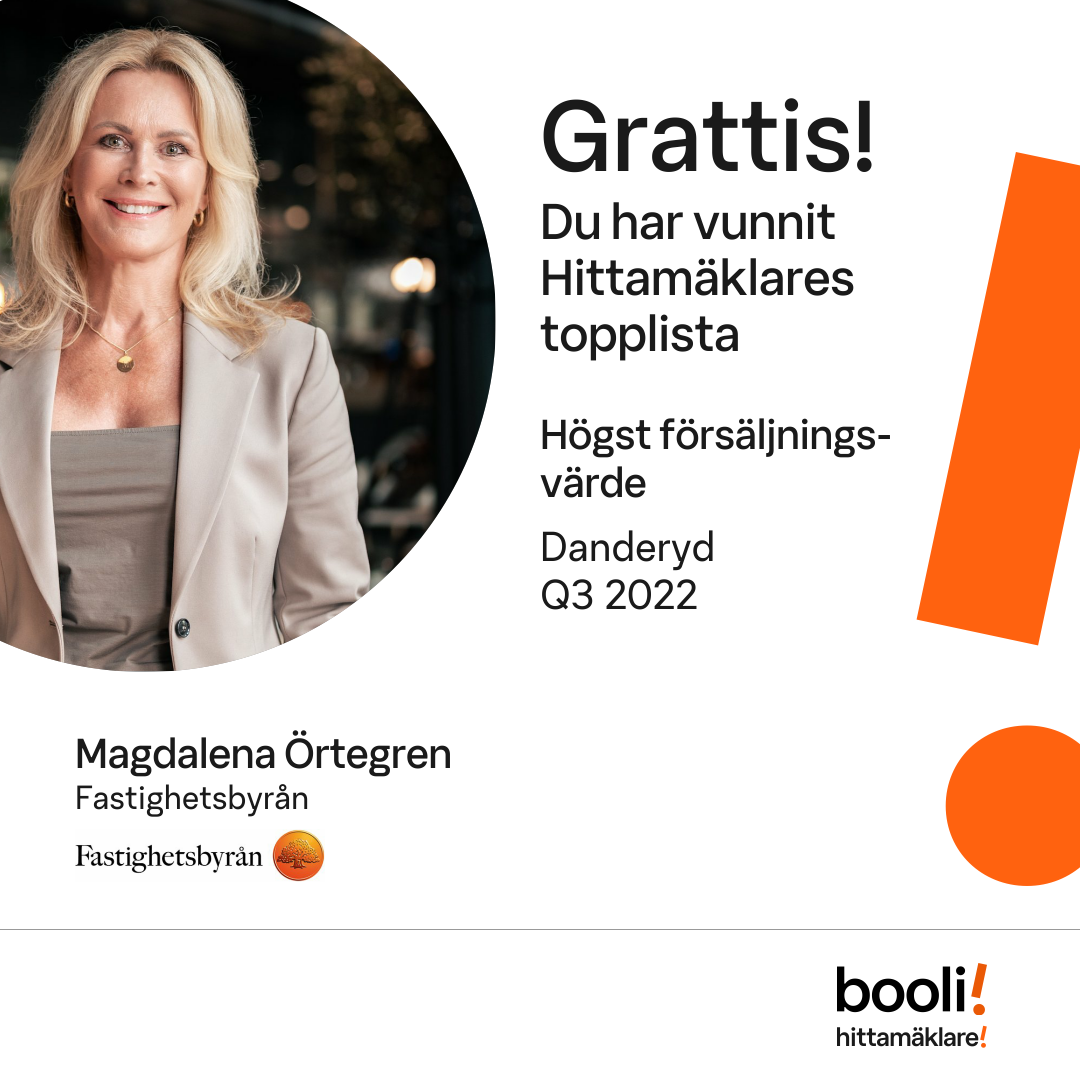 Statistik för publicerade bostäder, försäljningar och omdömen baseras på data från Booli och Hittamäklare. Statistiken för försäljningar avser inrapporterade och verifierade slutpriser från mäklare eller av Booli inhämtade och verifierade slutpriser. Statistiken för publicerade bostäder baseras på information som publicerats på Booli.se. Statistik för omdömen och rekommendationer baseras på omdömen från säljare som lämnats via Booli och Hittamäklare.
