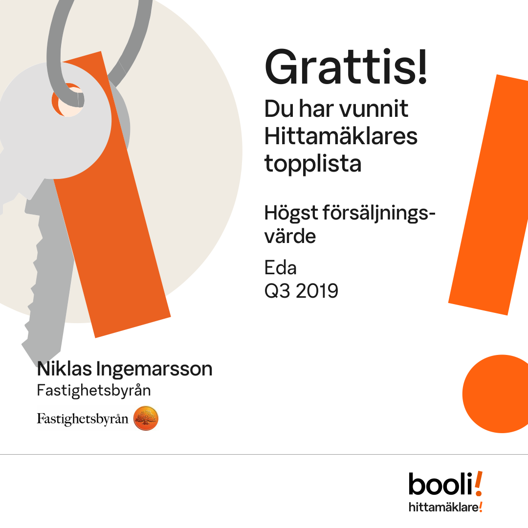 Statistik för publicerade bostäder, försäljningar och omdömen baseras på data från Booli och Hittamäklare. Statistiken för försäljningar avser inrapporterade och verifierade slutpriser från mäklare eller av Booli inhämtade och verifierade slutpriser. Statistiken för publicerade bostäder baseras på information som publicerats på Booli.se. Statistik för omdömen och rekommendationer baseras på omdömen från säljare som lämnats via Booli och Hittamäklare.