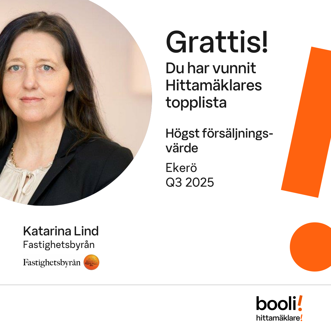 Statistik för publicerade bostäder, försäljningar och omdömen baseras på data från Booli och Hittamäklare. Statistiken för försäljningar avser inrapporterade och verifierade slutpriser från mäklare eller av Booli inhämtade och verifierade slutpriser. Statistiken för publicerade bostäder baseras på information som publicerats på Booli.se. Statistik för omdömen och rekommendationer baseras på omdömen från säljare som lämnats via Booli och Hittamäklare.