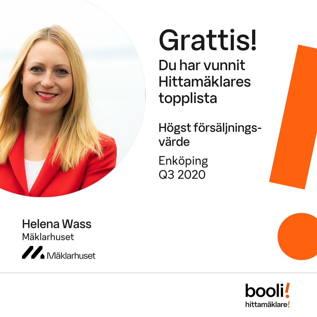 Statistik för publicerade bostäder, försäljningar och omdömen baseras på data från Booli och Hittamäklare. Statistiken för försäljningar avser inrapporterade och verifierade slutpriser från mäklare eller av Booli inhämtade och verifierade slutpriser. Statistiken för publicerade bostäder baseras på information som publicerats på Booli.se. Statistik för omdömen och rekommendationer baseras på omdömen från säljare som lämnats via Booli och Hittamäklare.