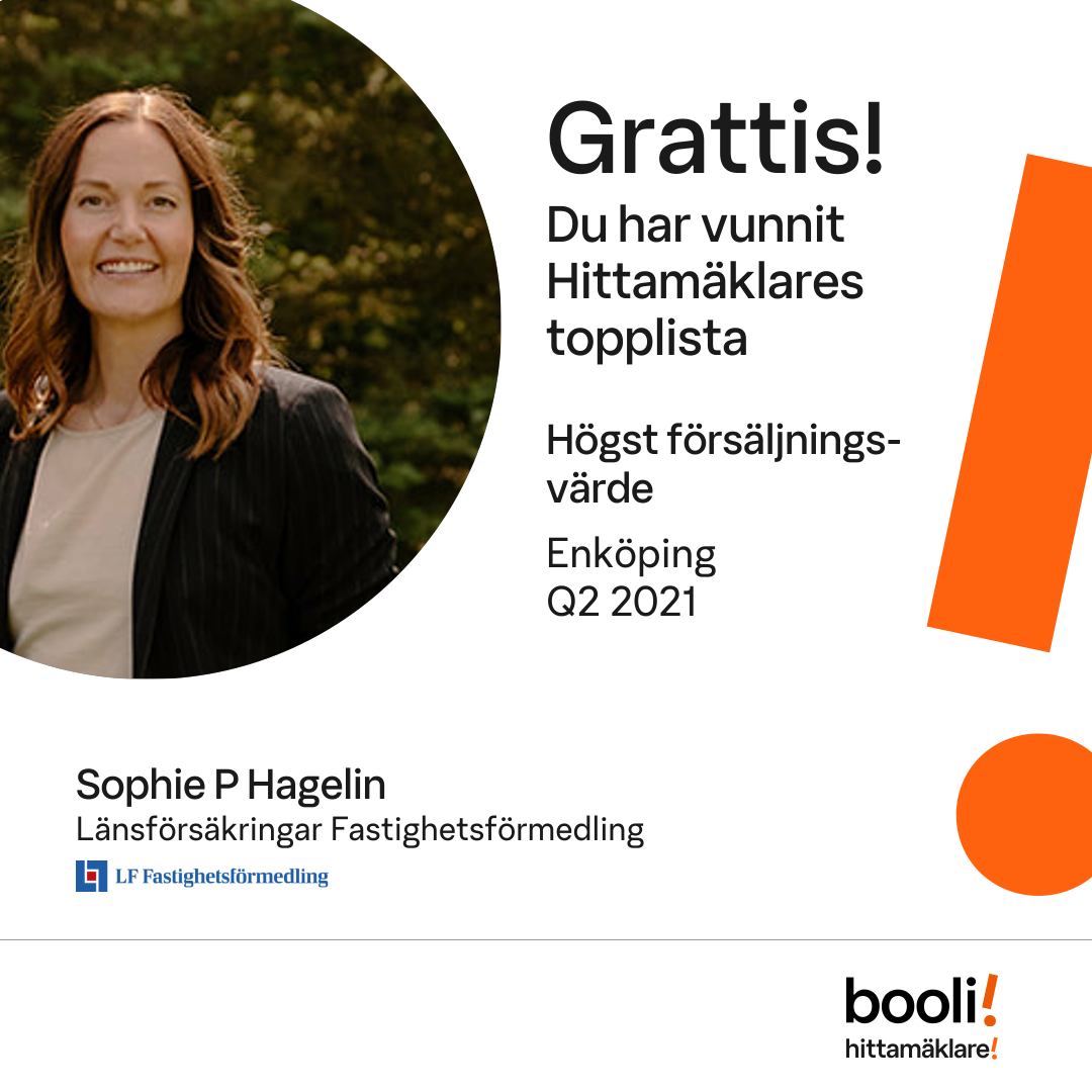Statistik för publicerade bostäder, försäljningar och omdömen baseras på data från Booli och Hittamäklare. Statistiken för försäljningar avser inrapporterade och verifierade slutpriser från mäklare eller av Booli inhämtade och verifierade slutpriser. Statistiken för publicerade bostäder baseras på information som publicerats på Booli.se. Statistik för omdömen och rekommendationer baseras på omdömen från säljare som lämnats via Booli och Hittamäklare.