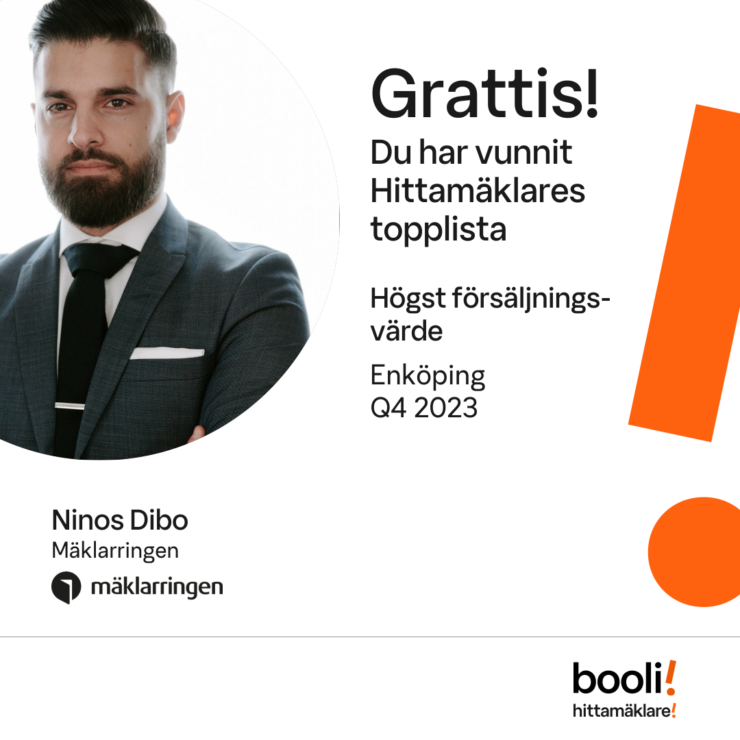 Statistik för publicerade bostäder, försäljningar och omdömen baseras på data från Booli och Hittamäklare. Statistiken för försäljningar avser inrapporterade och verifierade slutpriser från mäklare eller av Booli inhämtade och verifierade slutpriser. Statistiken för publicerade bostäder baseras på information som publicerats på Booli.se. Statistik för omdömen och rekommendationer baseras på omdömen från säljare som lämnats via Booli och Hittamäklare.