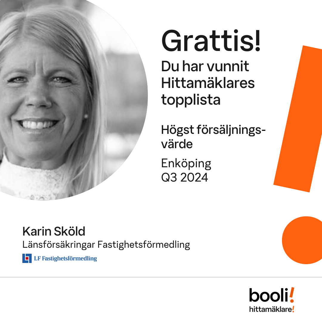 Statistik för publicerade bostäder, försäljningar och omdömen baseras på data från Booli och Hittamäklare. Statistiken för försäljningar avser inrapporterade och verifierade slutpriser från mäklare eller av Booli inhämtade och verifierade slutpriser. Statistiken för publicerade bostäder baseras på information som publicerats på Booli.se. Statistik för omdömen och rekommendationer baseras på omdömen från säljare som lämnats via Booli och Hittamäklare.