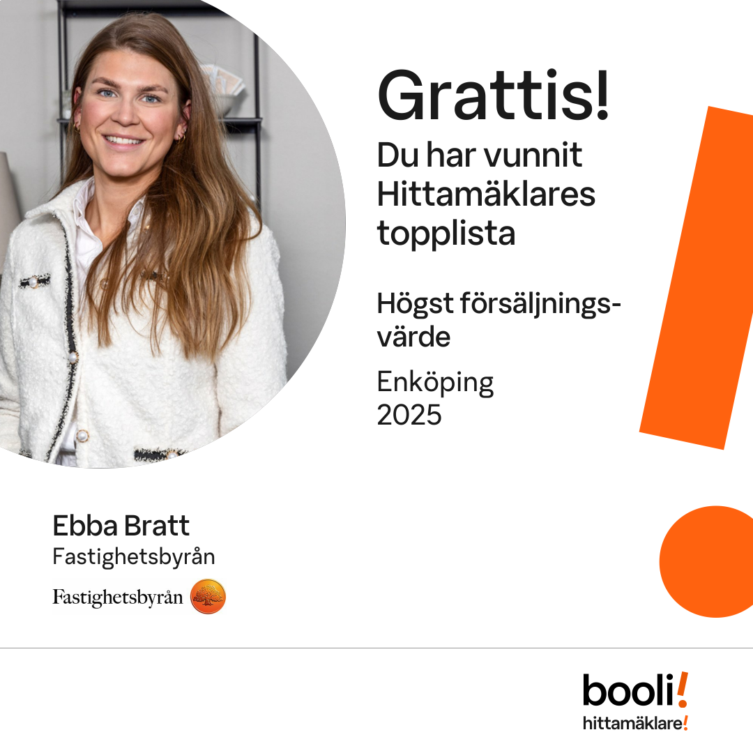 Statistik för publicerade bostäder, försäljningar och omdömen baseras på data från Booli och Hittamäklare. Statistiken för försäljningar avser inrapporterade och verifierade slutpriser från mäklare eller av Booli inhämtade och verifierade slutpriser. Statistiken för publicerade bostäder baseras på information som publicerats på Booli.se. Statistik för omdömen och rekommendationer baseras på omdömen från säljare som lämnats via Booli och Hittamäklare.