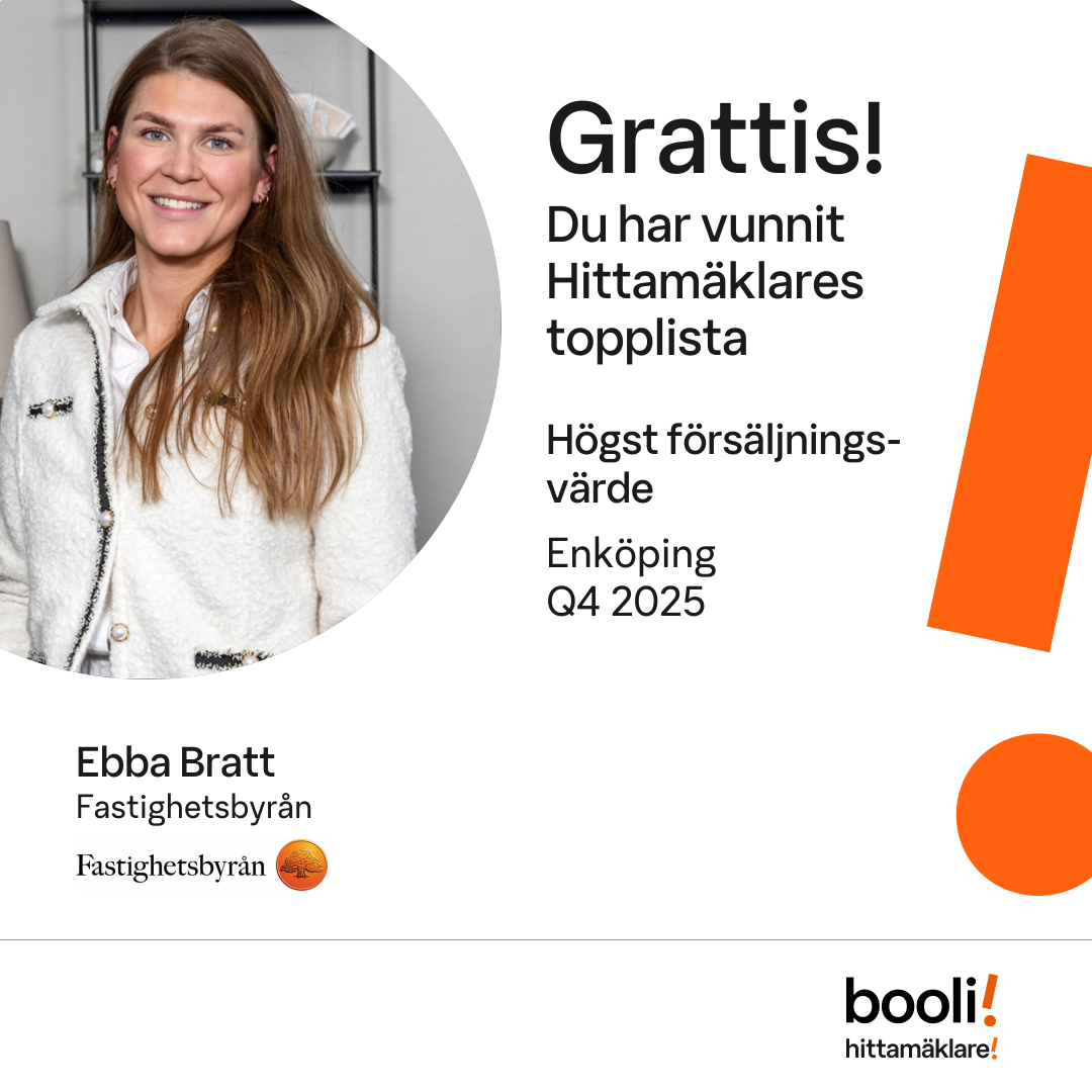 Statistik för publicerade bostäder, försäljningar och omdömen baseras på data från Booli och Hittamäklare. Statistiken för försäljningar avser inrapporterade och verifierade slutpriser från mäklare eller av Booli inhämtade och verifierade slutpriser. Statistiken för publicerade bostäder baseras på information som publicerats på Booli.se. Statistik för omdömen och rekommendationer baseras på omdömen från säljare som lämnats via Booli och Hittamäklare.
