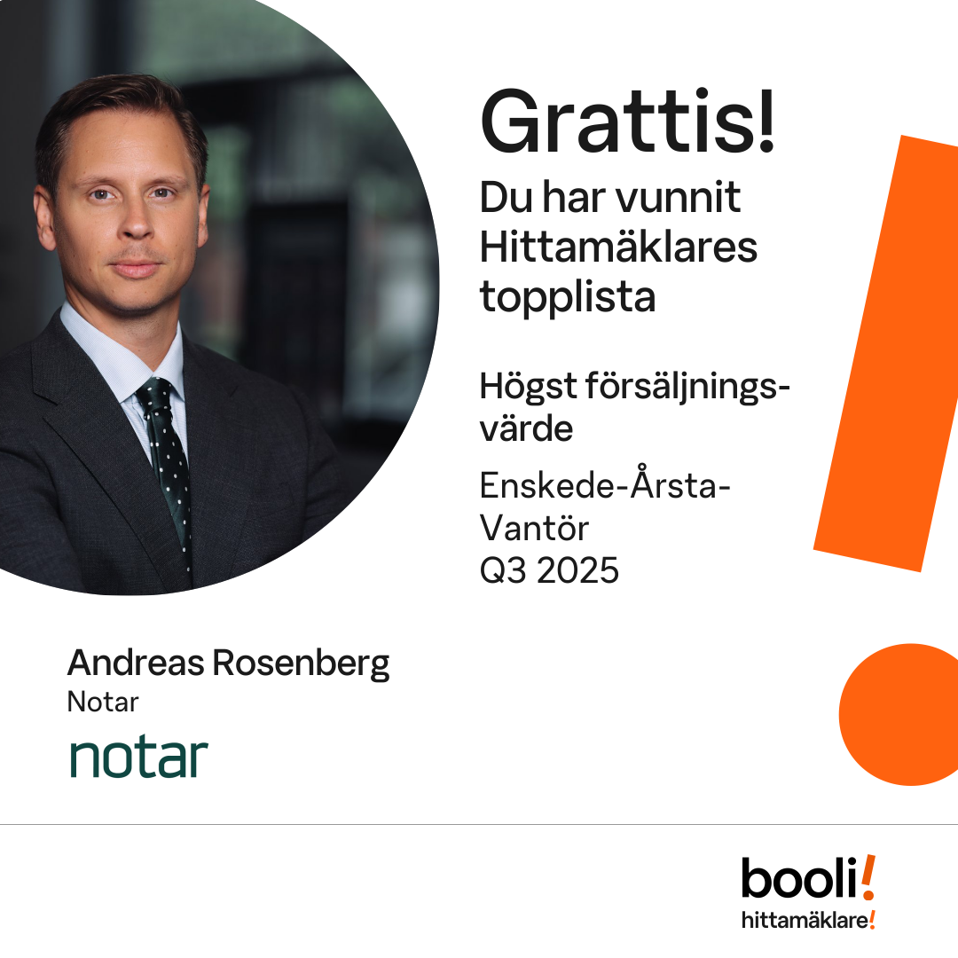 Statistik för publicerade bostäder, försäljningar och omdömen baseras på data från Booli och Hittamäklare. Statistiken för försäljningar avser inrapporterade och verifierade slutpriser från mäklare eller av Booli inhämtade och verifierade slutpriser. Statistiken för publicerade bostäder baseras på information som publicerats på Booli.se. Statistik för omdömen och rekommendationer baseras på omdömen från säljare som lämnats via Booli och Hittamäklare.