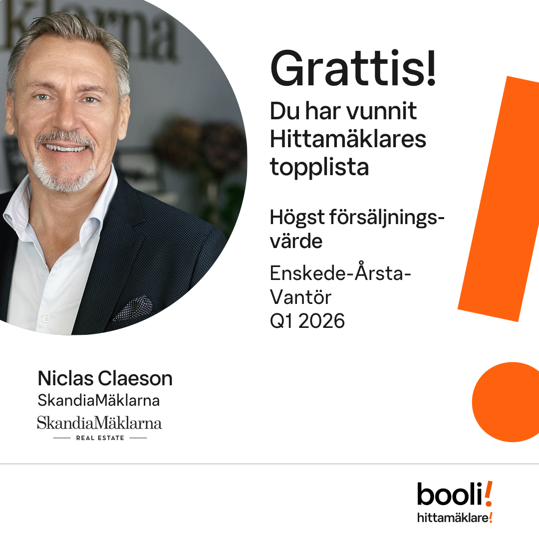 Statistik för publicerade bostäder, försäljningar och omdömen baseras på data från Booli och Hittamäklare. Statistiken för försäljningar avser inrapporterade och verifierade slutpriser från mäklare eller av Booli inhämtade och verifierade slutpriser. Statistiken för publicerade bostäder baseras på information som publicerats på Booli.se. Statistik för omdömen och rekommendationer baseras på omdömen från säljare som lämnats via Booli och Hittamäklare.
