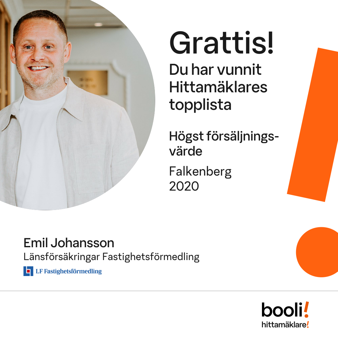 Statistik för publicerade bostäder, försäljningar och omdömen baseras på data från Booli och Hittamäklare. Statistiken för försäljningar avser inrapporterade och verifierade slutpriser från mäklare eller av Booli inhämtade och verifierade slutpriser. Statistiken för publicerade bostäder baseras på information som publicerats på Booli.se. Statistik för omdömen och rekommendationer baseras på omdömen från säljare som lämnats via Booli och Hittamäklare.