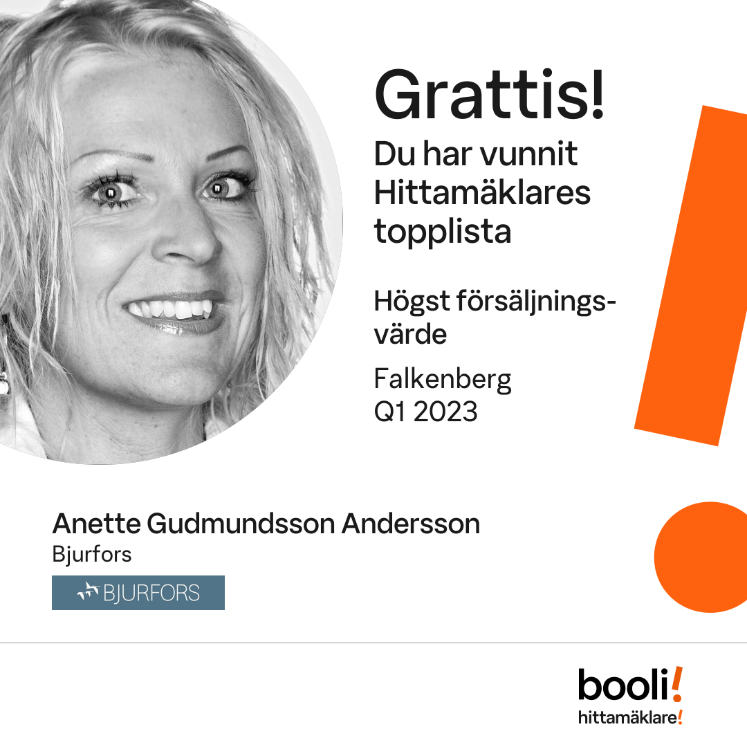 Statistik för publicerade bostäder, försäljningar och omdömen baseras på data från Booli och Hittamäklare. Statistiken för försäljningar avser inrapporterade och verifierade slutpriser från mäklare eller av Booli inhämtade och verifierade slutpriser. Statistiken för publicerade bostäder baseras på information som publicerats på Booli.se. Statistik för omdömen och rekommendationer baseras på omdömen från säljare som lämnats via Booli och Hittamäklare.