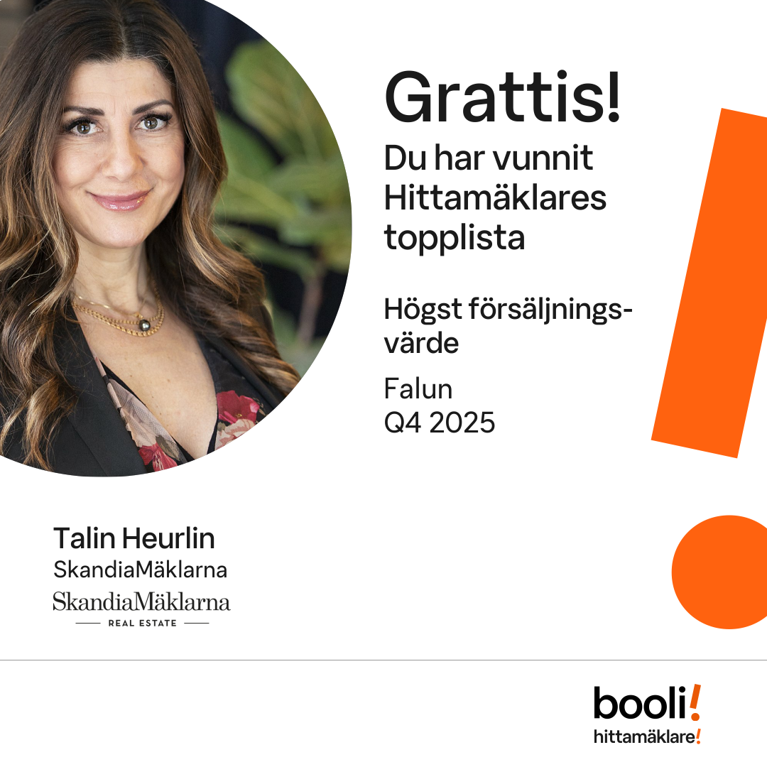 Statistik för publicerade bostäder, försäljningar och omdömen baseras på data från Booli och Hittamäklare. Statistiken för försäljningar avser inrapporterade och verifierade slutpriser från mäklare eller av Booli inhämtade och verifierade slutpriser. Statistiken för publicerade bostäder baseras på information som publicerats på Booli.se. Statistik för omdömen och rekommendationer baseras på omdömen från säljare som lämnats via Booli och Hittamäklare.