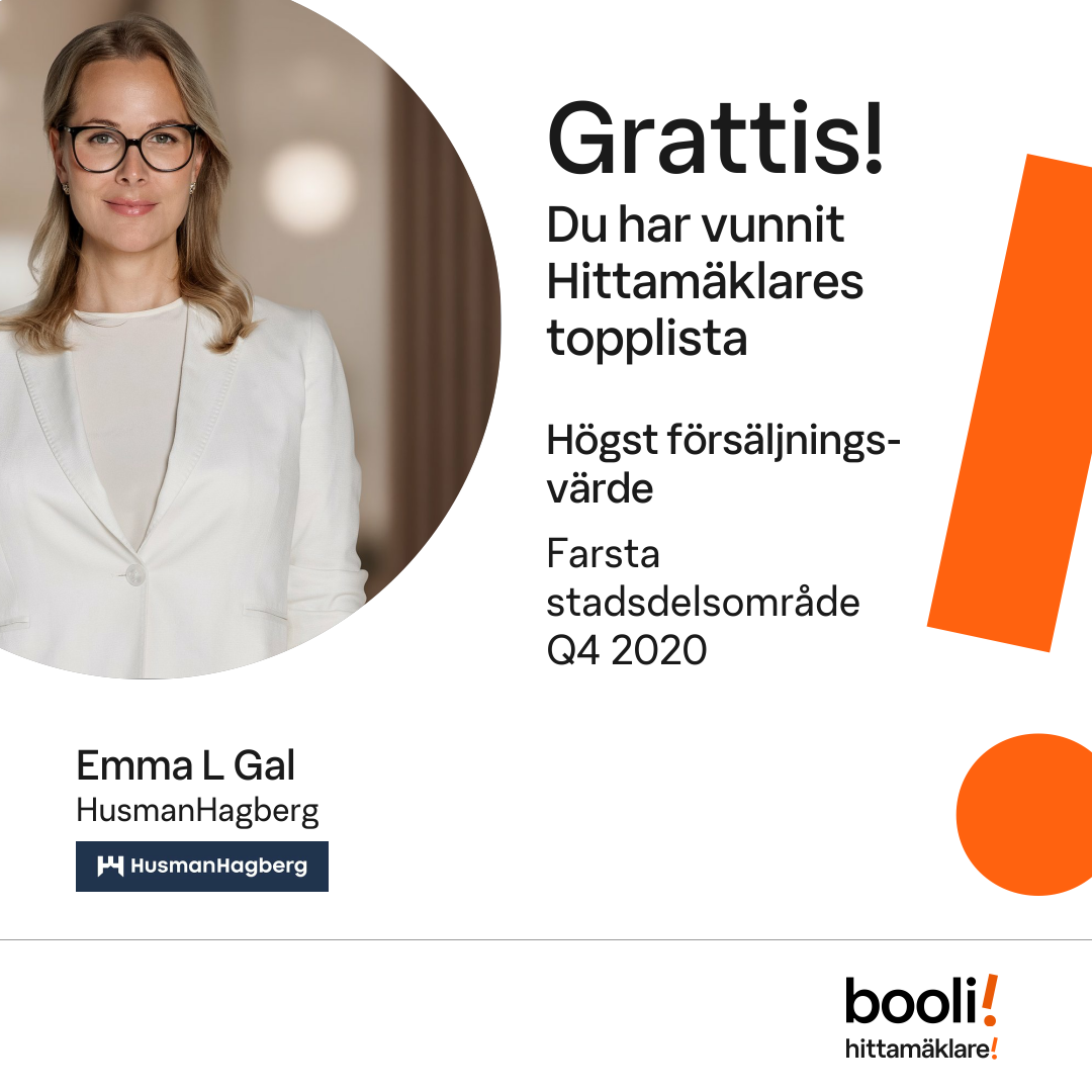 Statistik för publicerade bostäder, försäljningar och omdömen baseras på data från Booli och Hittamäklare. Statistiken för försäljningar avser inrapporterade och verifierade slutpriser från mäklare eller av Booli inhämtade och verifierade slutpriser. Statistiken för publicerade bostäder baseras på information som publicerats på Booli.se. Statistik för omdömen och rekommendationer baseras på omdömen från säljare som lämnats via Booli och Hittamäklare.