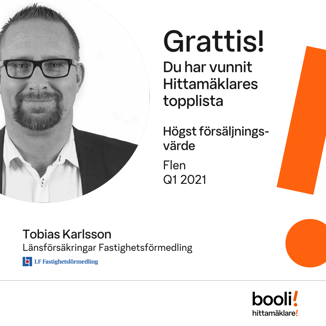 Statistik för publicerade bostäder, försäljningar och omdömen baseras på data från Booli och Hittamäklare. Statistiken för försäljningar avser inrapporterade och verifierade slutpriser från mäklare eller av Booli inhämtade och verifierade slutpriser. Statistiken för publicerade bostäder baseras på information som publicerats på Booli.se. Statistik för omdömen och rekommendationer baseras på omdömen från säljare som lämnats via Booli och Hittamäklare.