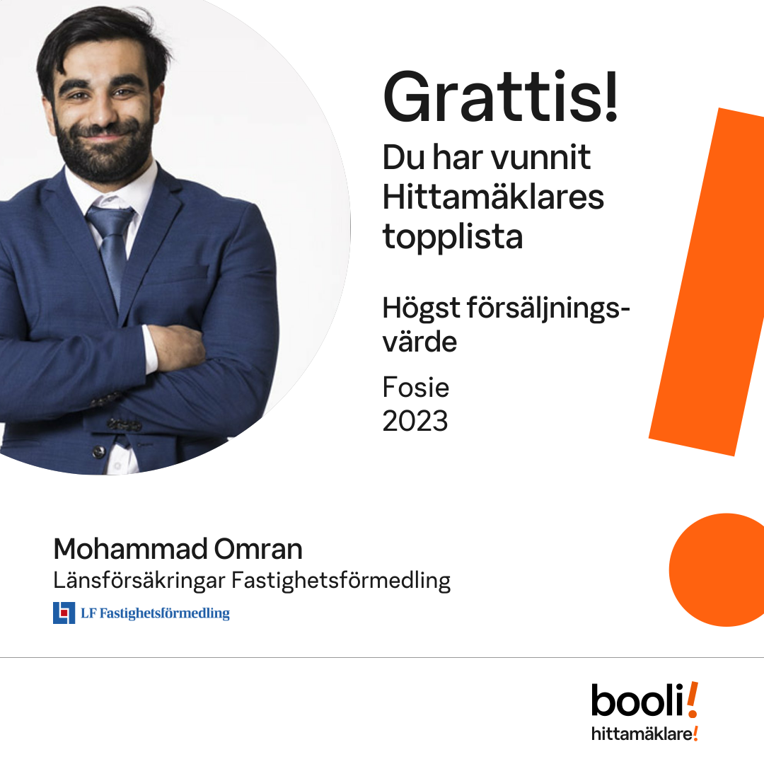 Statistik för publicerade bostäder, försäljningar och omdömen baseras på data från Booli och Hittamäklare. Statistiken för försäljningar avser inrapporterade och verifierade slutpriser från mäklare eller av Booli inhämtade och verifierade slutpriser. Statistiken för publicerade bostäder baseras på information som publicerats på Booli.se. Statistik för omdömen och rekommendationer baseras på omdömen från säljare som lämnats via Booli och Hittamäklare.