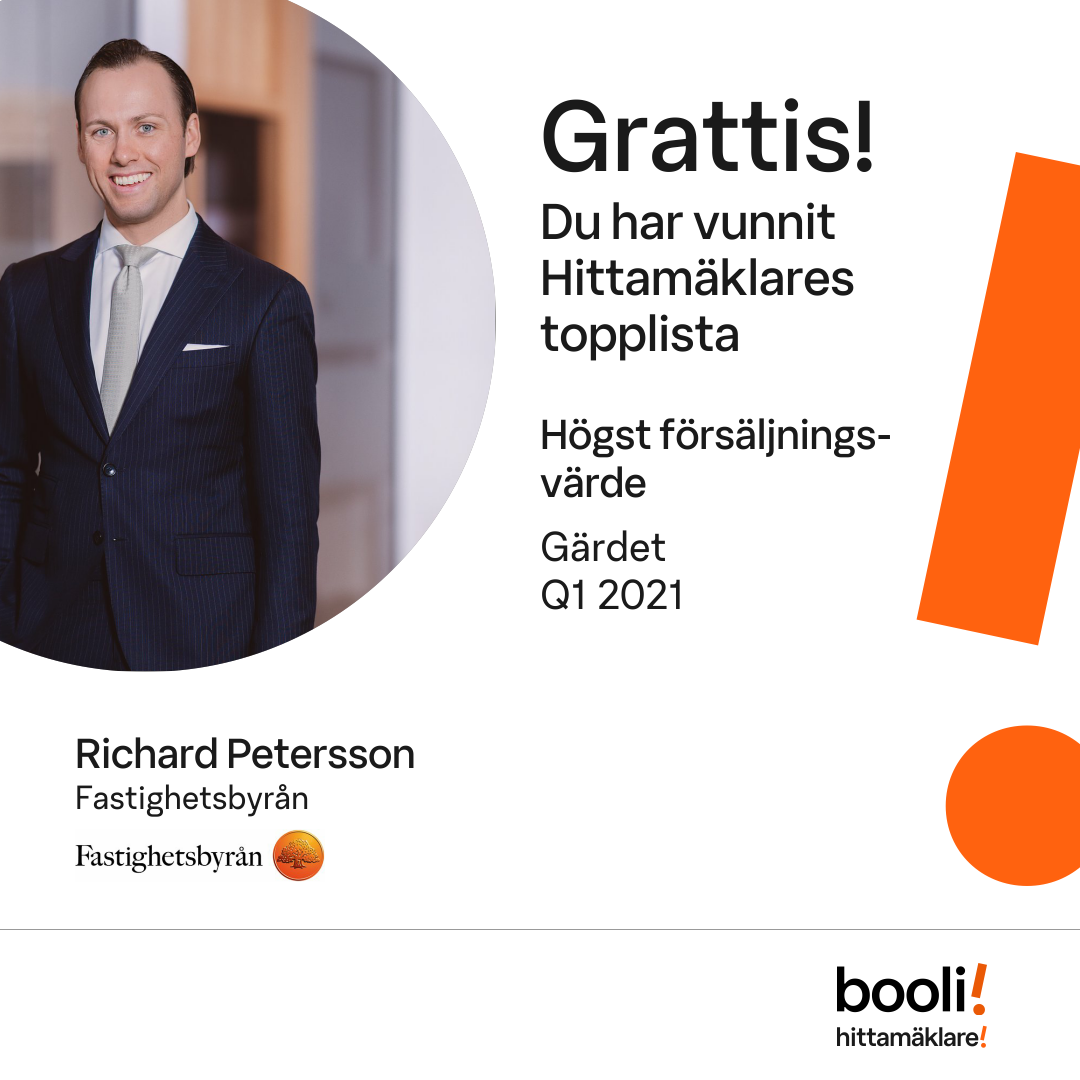 Statistik för publicerade bostäder, försäljningar och omdömen baseras på data från Booli och Hittamäklare. Statistiken för försäljningar avser inrapporterade och verifierade slutpriser från mäklare eller av Booli inhämtade och verifierade slutpriser. Statistiken för publicerade bostäder baseras på information som publicerats på Booli.se. Statistik för omdömen och rekommendationer baseras på omdömen från säljare som lämnats via Booli och Hittamäklare.