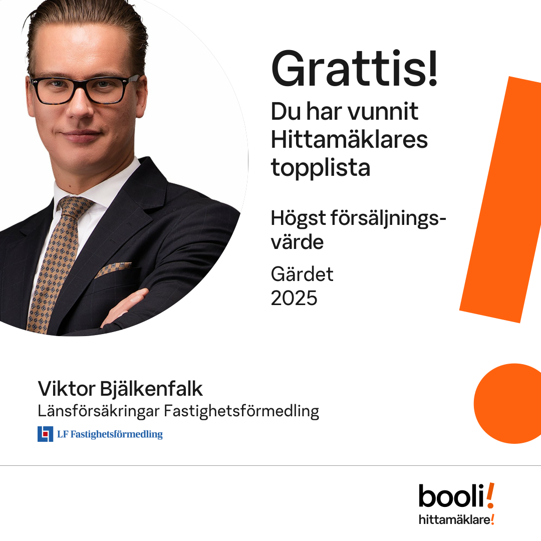 Statistik för publicerade bostäder, försäljningar och omdömen baseras på data från Booli och Hittamäklare. Statistiken för försäljningar avser inrapporterade och verifierade slutpriser från mäklare eller av Booli inhämtade och verifierade slutpriser. Statistiken för publicerade bostäder baseras på information som publicerats på Booli.se. Statistik för omdömen och rekommendationer baseras på omdömen från säljare som lämnats via Booli och Hittamäklare.