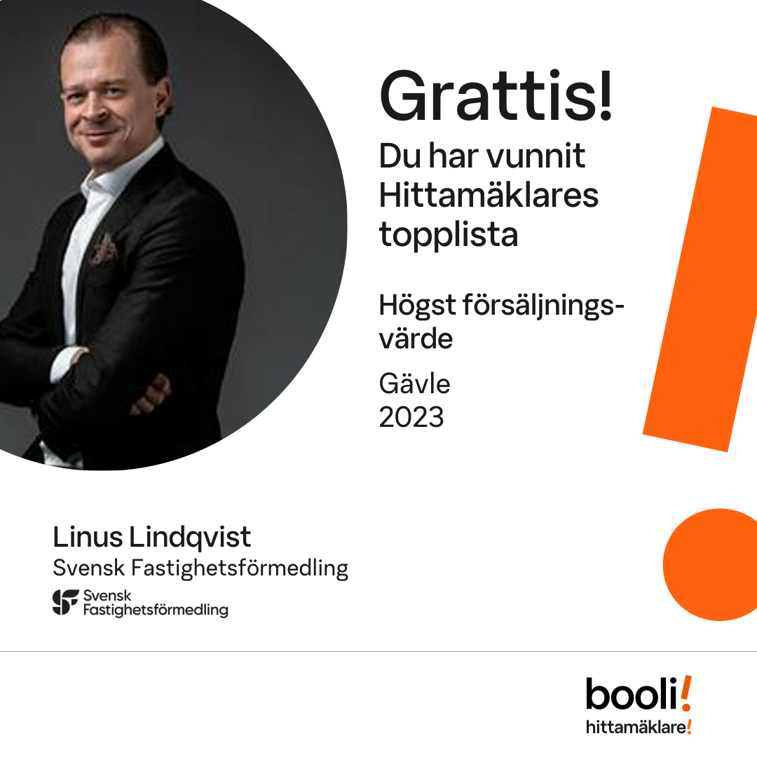 Statistik för publicerade bostäder, försäljningar och omdömen baseras på data från Booli. Statistiken för försäljningar avser inrapporterade och verifierade slutpriser från mäklare eller av Booli inhämtade och verifierade slutpriser. Statistiken för publicerade bostäder baseras på information som publicerats på Booli.se. Statistik för omdömen och rekommendationer baseras på omdömen från säljare som lämnats via Booli.