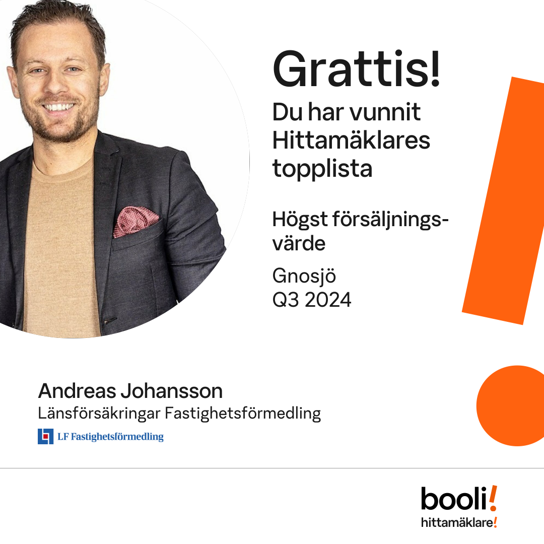 Statistik för publicerade bostäder, försäljningar och omdömen baseras på data från Booli och Hittamäklare. Statistiken för försäljningar avser inrapporterade och verifierade slutpriser från mäklare eller av Booli inhämtade och verifierade slutpriser. Statistiken för publicerade bostäder baseras på information som publicerats på Booli.se. Statistik för omdömen och rekommendationer baseras på omdömen från säljare som lämnats via Booli och Hittamäklare.