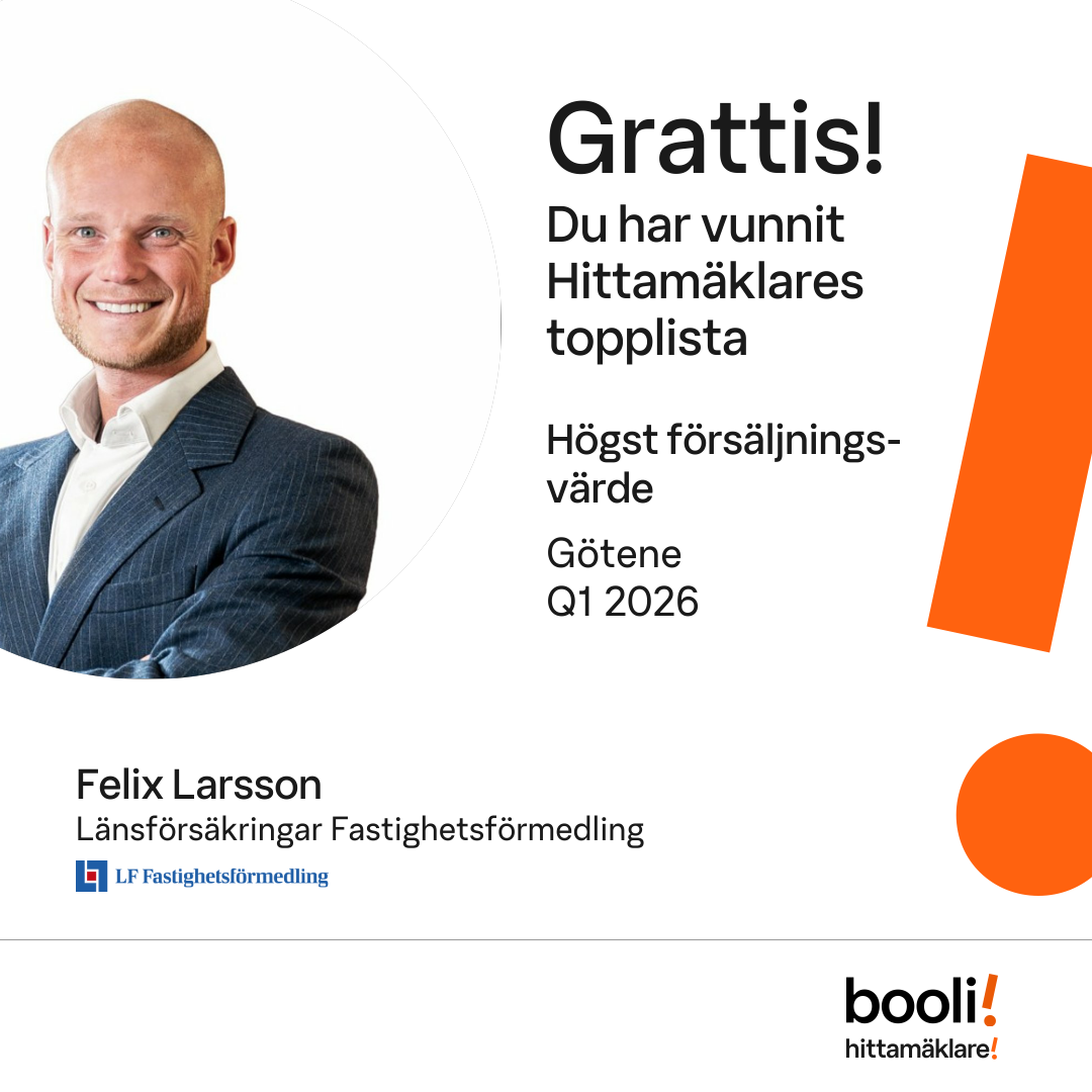 Statistik för publicerade bostäder, försäljningar och omdömen baseras på data från Booli. Statistiken för försäljningar avser inrapporterade och verifierade slutpriser från mäklare eller av Booli inhämtade och verifierade slutpriser. Statistiken för publicerade bostäder baseras på information som publicerats på Booli.se. Statistik för omdömen och rekommendationer baseras på omdömen från säljare som lämnats via Booli.