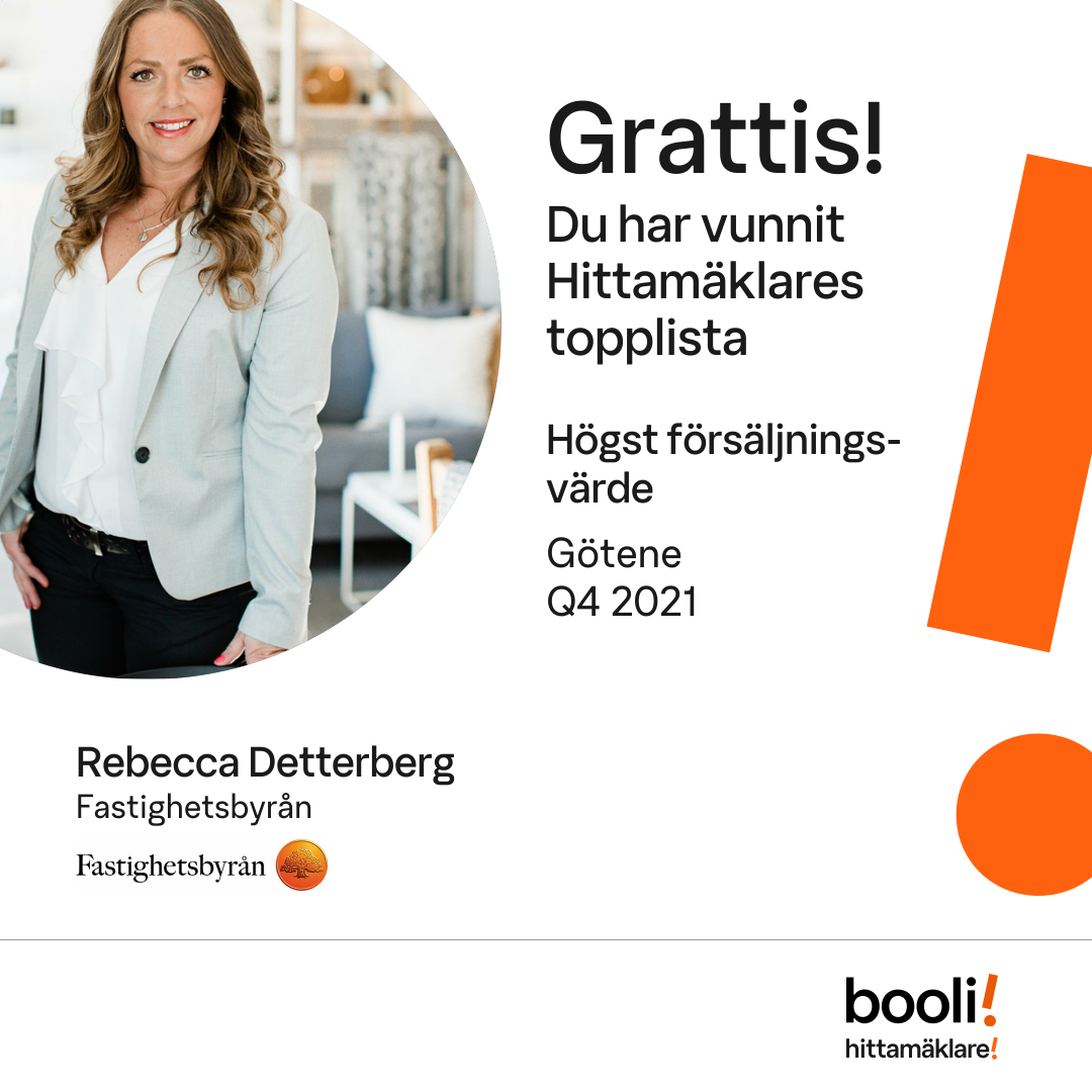 Statistik för publicerade bostäder, försäljningar och omdömen baseras på data från Booli och Hittamäklare. Statistiken för försäljningar avser inrapporterade och verifierade slutpriser från mäklare eller av Booli inhämtade och verifierade slutpriser. Statistiken för publicerade bostäder baseras på information som publicerats på Booli.se. Statistik för omdömen och rekommendationer baseras på omdömen från säljare som lämnats via Booli och Hittamäklare.