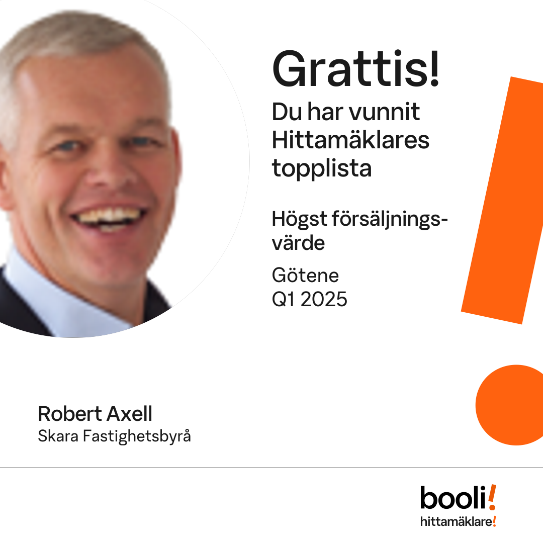 Statistik för publicerade bostäder, försäljningar och omdömen baseras på data från Booli och Hittamäklare. Statistiken för försäljningar avser inrapporterade och verifierade slutpriser från mäklare eller av Booli inhämtade och verifierade slutpriser. Statistiken för publicerade bostäder baseras på information som publicerats på Booli.se. Statistik för omdömen och rekommendationer baseras på omdömen från säljare som lämnats via Booli och Hittamäklare.