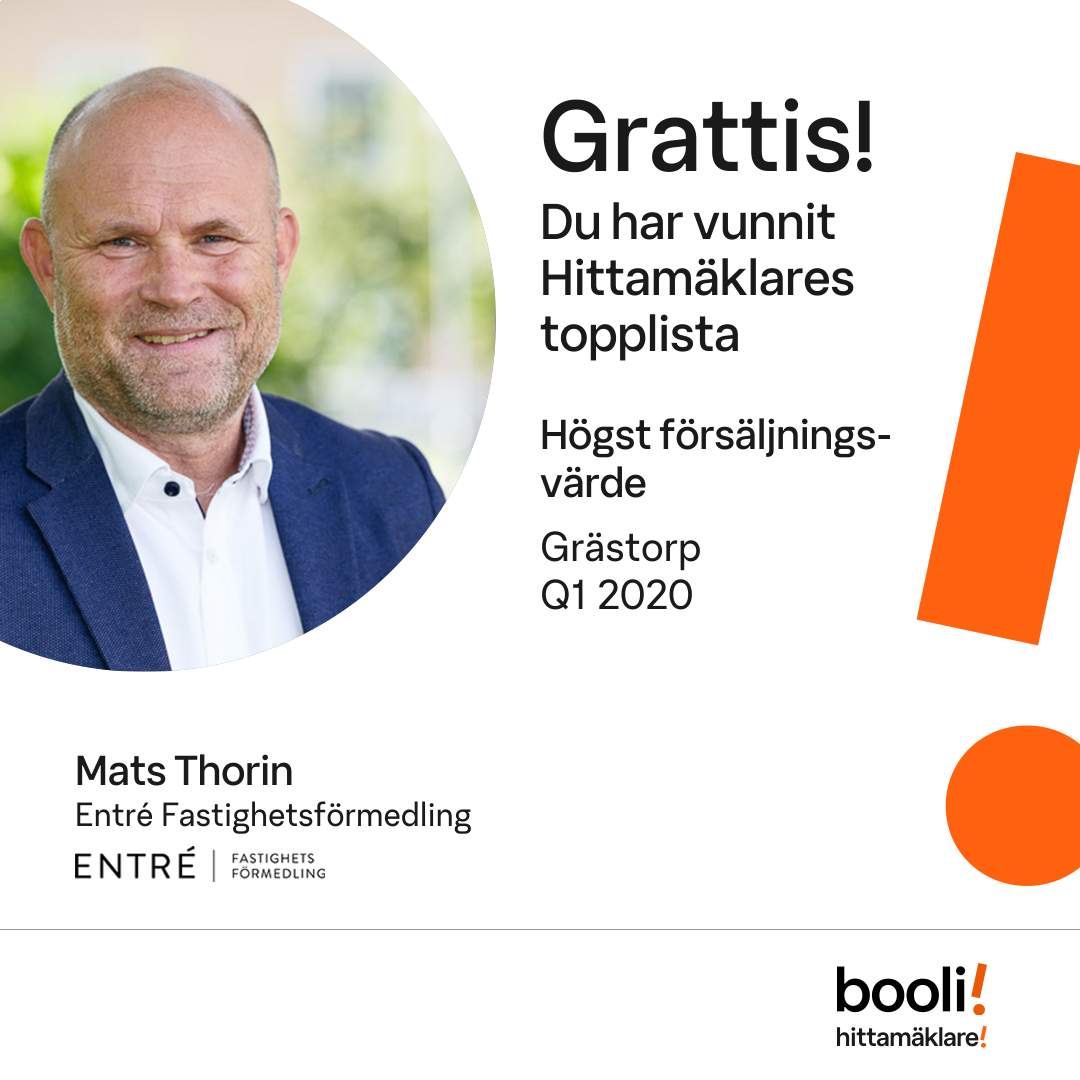 Statistik för publicerade bostäder, försäljningar och omdömen baseras på data från Booli och Hittamäklare. Statistiken för försäljningar avser inrapporterade och verifierade slutpriser från mäklare eller av Booli inhämtade och verifierade slutpriser. Statistiken för publicerade bostäder baseras på information som publicerats på Booli.se. Statistik för omdömen och rekommendationer baseras på omdömen från säljare som lämnats via Booli och Hittamäklare.