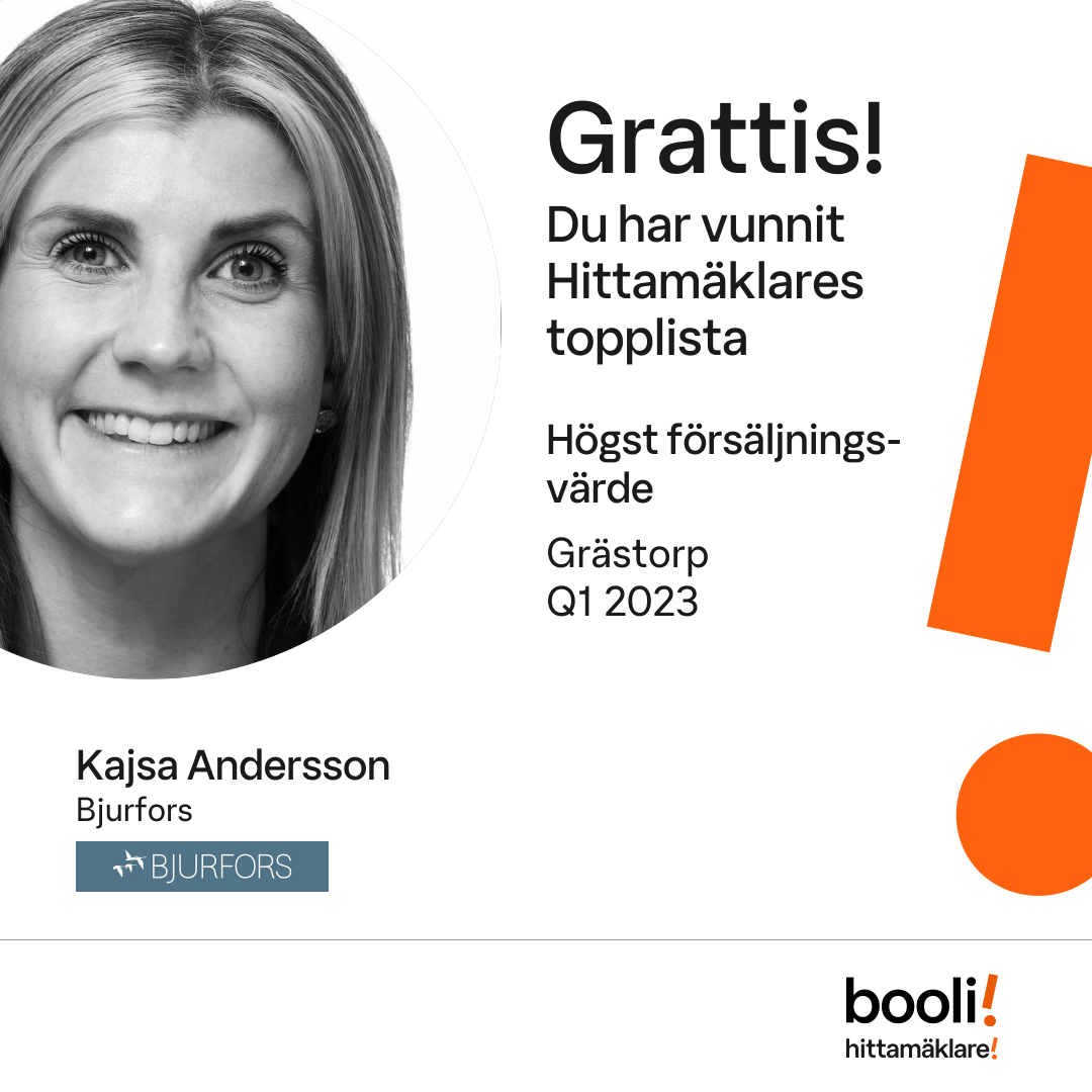 Statistik för publicerade bostäder, försäljningar och omdömen baseras på data från Booli och Hittamäklare. Statistiken för försäljningar avser inrapporterade och verifierade slutpriser från mäklare eller av Booli inhämtade och verifierade slutpriser. Statistiken för publicerade bostäder baseras på information som publicerats på Booli.se. Statistik för omdömen och rekommendationer baseras på omdömen från säljare som lämnats via Booli och Hittamäklare.