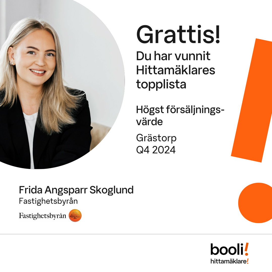 Statistik för publicerade bostäder, försäljningar och omdömen baseras på data från Booli och Hittamäklare. Statistiken för försäljningar avser inrapporterade och verifierade slutpriser från mäklare eller av Booli inhämtade och verifierade slutpriser. Statistiken för publicerade bostäder baseras på information som publicerats på Booli.se. Statistik för omdömen och rekommendationer baseras på omdömen från säljare som lämnats via Booli och Hittamäklare.