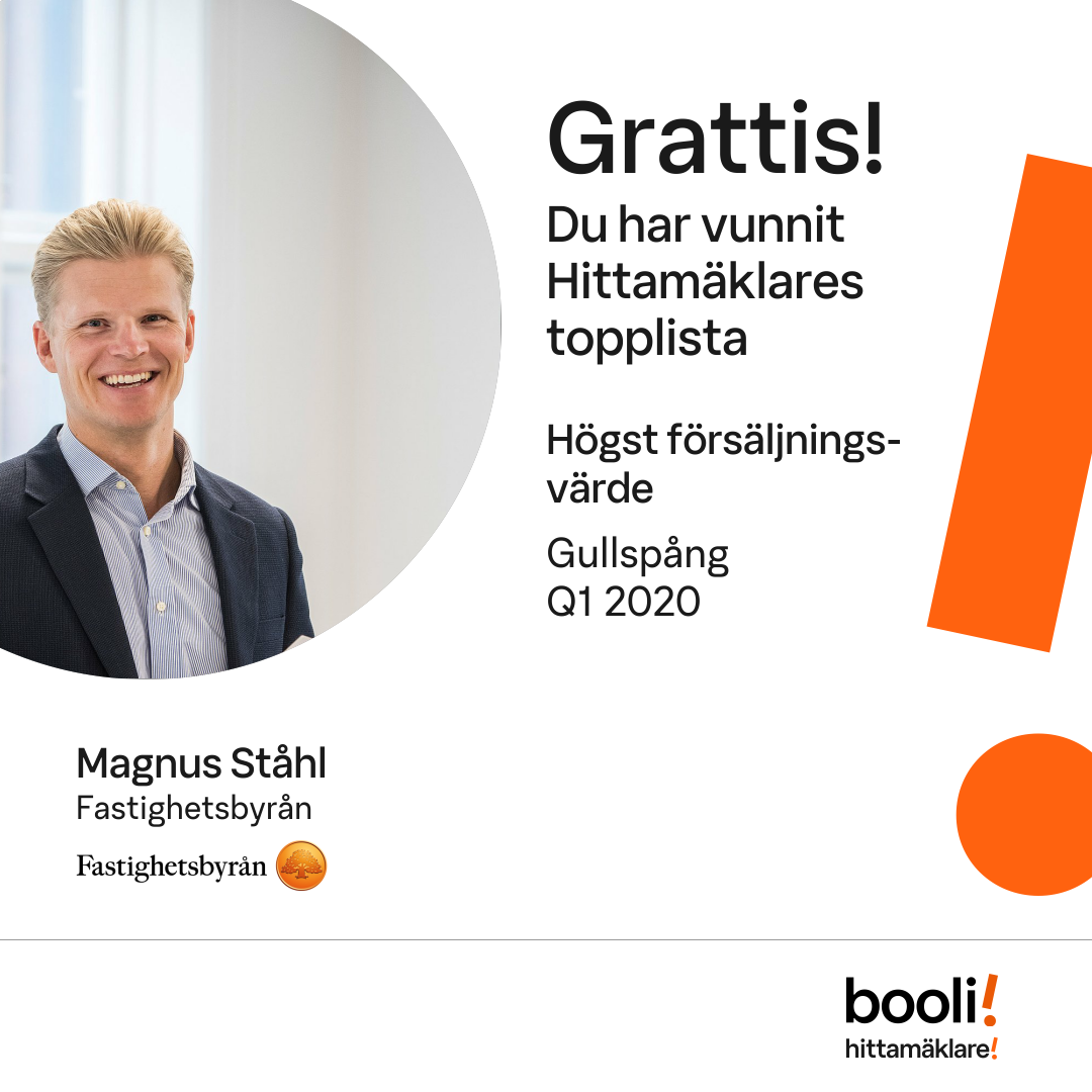 Statistik för publicerade bostäder, försäljningar och omdömen baseras på data från Booli och Hittamäklare. Statistiken för försäljningar avser inrapporterade och verifierade slutpriser från mäklare eller av Booli inhämtade och verifierade slutpriser. Statistiken för publicerade bostäder baseras på information som publicerats på Booli.se. Statistik för omdömen och rekommendationer baseras på omdömen från säljare som lämnats via Booli och Hittamäklare.