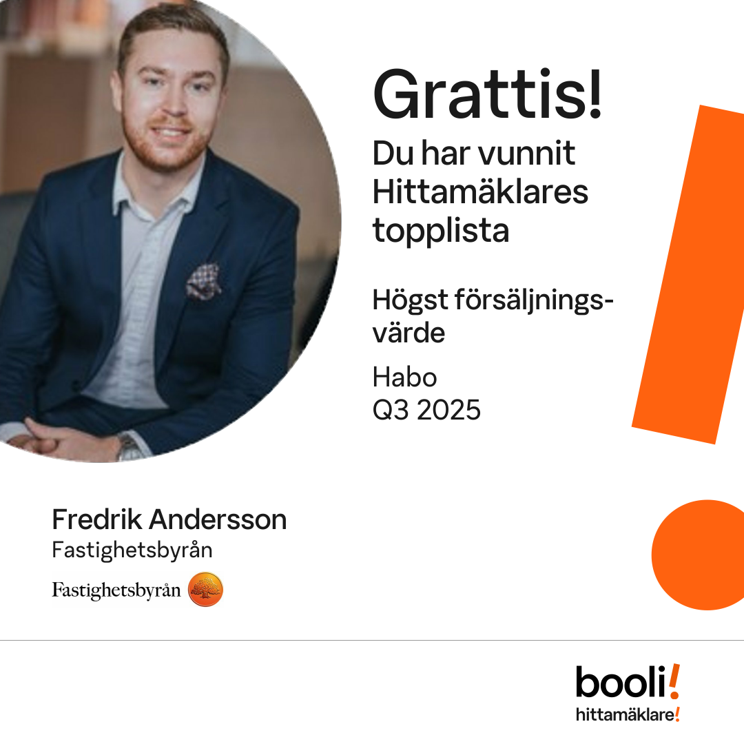 Statistik för publicerade bostäder, försäljningar och omdömen baseras på data från Booli och Hittamäklare. Statistiken för försäljningar avser inrapporterade och verifierade slutpriser från mäklare eller av Booli inhämtade och verifierade slutpriser. Statistiken för publicerade bostäder baseras på information som publicerats på Booli.se. Statistik för omdömen och rekommendationer baseras på omdömen från säljare som lämnats via Booli och Hittamäklare.