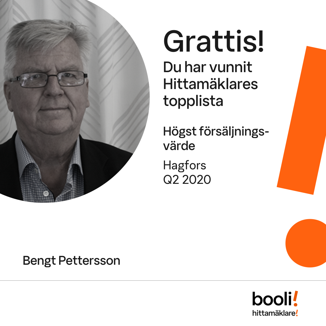 Statistik för publicerade bostäder, försäljningar och omdömen baseras på data från Booli och Hittamäklare. Statistiken för försäljningar avser inrapporterade och verifierade slutpriser från mäklare eller av Booli inhämtade och verifierade slutpriser. Statistiken för publicerade bostäder baseras på information som publicerats på Booli.se. Statistik för omdömen och rekommendationer baseras på omdömen från säljare som lämnats via Booli och Hittamäklare.