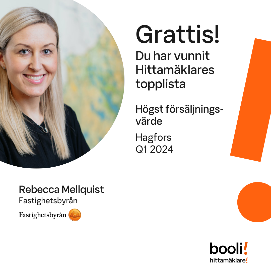 Statistik för publicerade bostäder, försäljningar och omdömen baseras på data från Booli och Hittamäklare. Statistiken för försäljningar avser inrapporterade och verifierade slutpriser från mäklare eller av Booli inhämtade och verifierade slutpriser. Statistiken för publicerade bostäder baseras på information som publicerats på Booli.se. Statistik för omdömen och rekommendationer baseras på omdömen från säljare som lämnats via Booli och Hittamäklare.