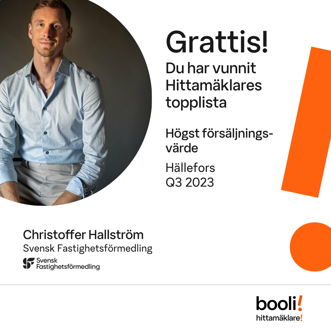 Statistik för publicerade bostäder, försäljningar och omdömen baseras på data från Booli och Hittamäklare. Statistiken för försäljningar avser inrapporterade och verifierade slutpriser från mäklare eller av Booli inhämtade och verifierade slutpriser. Statistiken för publicerade bostäder baseras på information som publicerats på Booli.se. Statistik för omdömen och rekommendationer baseras på omdömen från säljare som lämnats via Booli och Hittamäklare.