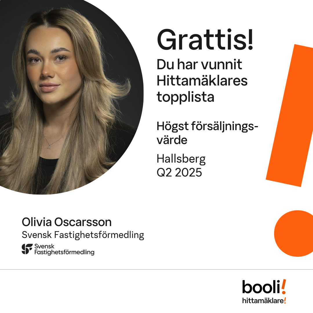Statistik för publicerade bostäder, försäljningar och omdömen baseras på data från Booli och Hittamäklare. Statistiken för försäljningar avser inrapporterade och verifierade slutpriser från mäklare eller av Booli inhämtade och verifierade slutpriser. Statistiken för publicerade bostäder baseras på information som publicerats på Booli.se. Statistik för omdömen och rekommendationer baseras på omdömen från säljare som lämnats via Booli och Hittamäklare.
