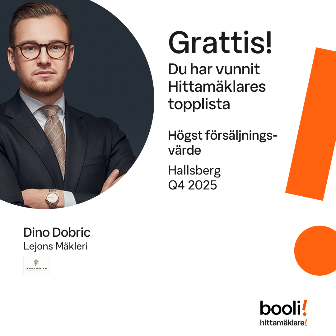 Statistik för publicerade bostäder, försäljningar och omdömen baseras på data från Booli och Hittamäklare. Statistiken för försäljningar avser inrapporterade och verifierade slutpriser från mäklare eller av Booli inhämtade och verifierade slutpriser. Statistiken för publicerade bostäder baseras på information som publicerats på Booli.se. Statistik för omdömen och rekommendationer baseras på omdömen från säljare som lämnats via Booli och Hittamäklare.