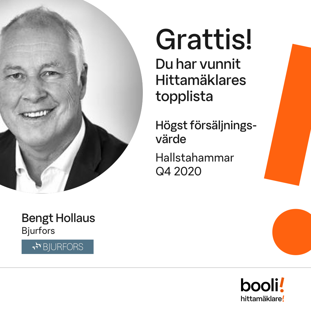 Statistik för publicerade bostäder, försäljningar och omdömen baseras på data från Booli och Hittamäklare. Statistiken för försäljningar avser inrapporterade och verifierade slutpriser från mäklare eller av Booli inhämtade och verifierade slutpriser. Statistiken för publicerade bostäder baseras på information som publicerats på Booli.se. Statistik för omdömen och rekommendationer baseras på omdömen från säljare som lämnats via Booli och Hittamäklare.