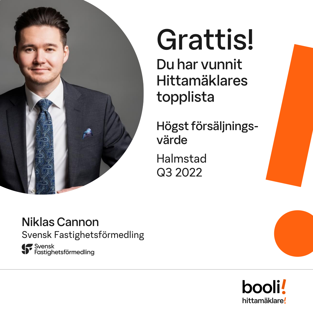 Statistik för publicerade bostäder, försäljningar och omdömen baseras på data från Booli och Hittamäklare. Statistiken för försäljningar avser inrapporterade och verifierade slutpriser från mäklare eller av Booli inhämtade och verifierade slutpriser. Statistiken för publicerade bostäder baseras på information som publicerats på Booli.se. Statistik för omdömen och rekommendationer baseras på omdömen från säljare som lämnats via Booli och Hittamäklare.