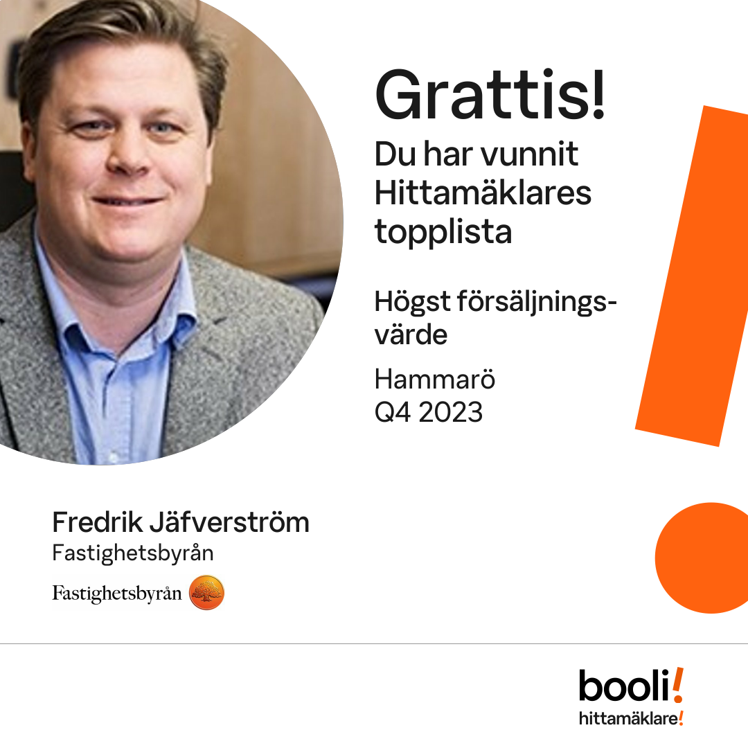 Statistik för publicerade bostäder, försäljningar och omdömen baseras på data från Booli och Hittamäklare. Statistiken för försäljningar avser inrapporterade och verifierade slutpriser från mäklare eller av Booli inhämtade och verifierade slutpriser. Statistiken för publicerade bostäder baseras på information som publicerats på Booli.se. Statistik för omdömen och rekommendationer baseras på omdömen från säljare som lämnats via Booli och Hittamäklare.