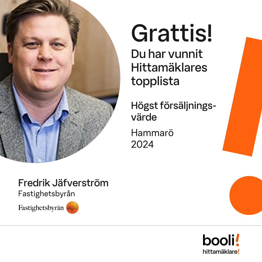Statistik för publicerade bostäder, försäljningar och omdömen baseras på data från Booli och Hittamäklare. Statistiken för försäljningar avser inrapporterade och verifierade slutpriser från mäklare eller av Booli inhämtade och verifierade slutpriser. Statistiken för publicerade bostäder baseras på information som publicerats på Booli.se. Statistik för omdömen och rekommendationer baseras på omdömen från säljare som lämnats via Booli och Hittamäklare.