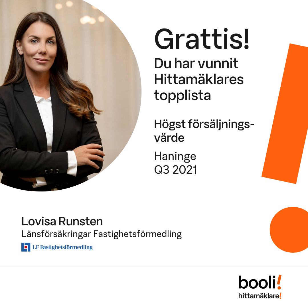 Statistik för publicerade bostäder, försäljningar och omdömen baseras på data från Booli och Hittamäklare. Statistiken för försäljningar avser inrapporterade och verifierade slutpriser från mäklare eller av Booli inhämtade och verifierade slutpriser. Statistiken för publicerade bostäder baseras på information som publicerats på Booli.se. Statistik för omdömen och rekommendationer baseras på omdömen från säljare som lämnats via Booli och Hittamäklare.