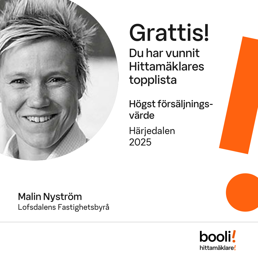 Statistik för publicerade bostäder, försäljningar och omdömen baseras på data från Booli och Hittamäklare. Statistiken för försäljningar avser inrapporterade och verifierade slutpriser från mäklare eller av Booli inhämtade och verifierade slutpriser. Statistiken för publicerade bostäder baseras på information som publicerats på Booli.se. Statistik för omdömen och rekommendationer baseras på omdömen från säljare som lämnats via Booli och Hittamäklare.