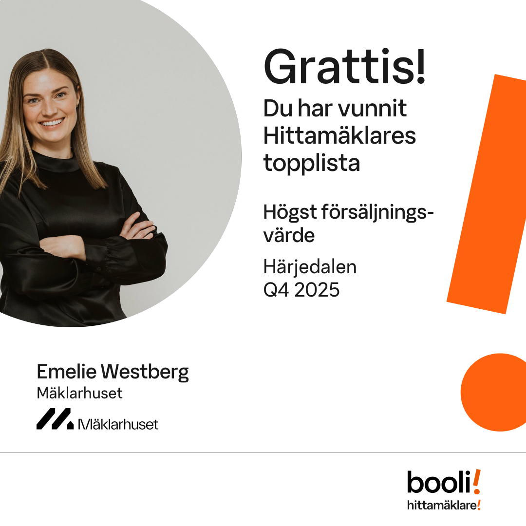 Statistik för publicerade bostäder, försäljningar och omdömen baseras på data från Booli och Hittamäklare. Statistiken för försäljningar avser inrapporterade och verifierade slutpriser från mäklare eller av Booli inhämtade och verifierade slutpriser. Statistiken för publicerade bostäder baseras på information som publicerats på Booli.se. Statistik för omdömen och rekommendationer baseras på omdömen från säljare som lämnats via Booli och Hittamäklare.