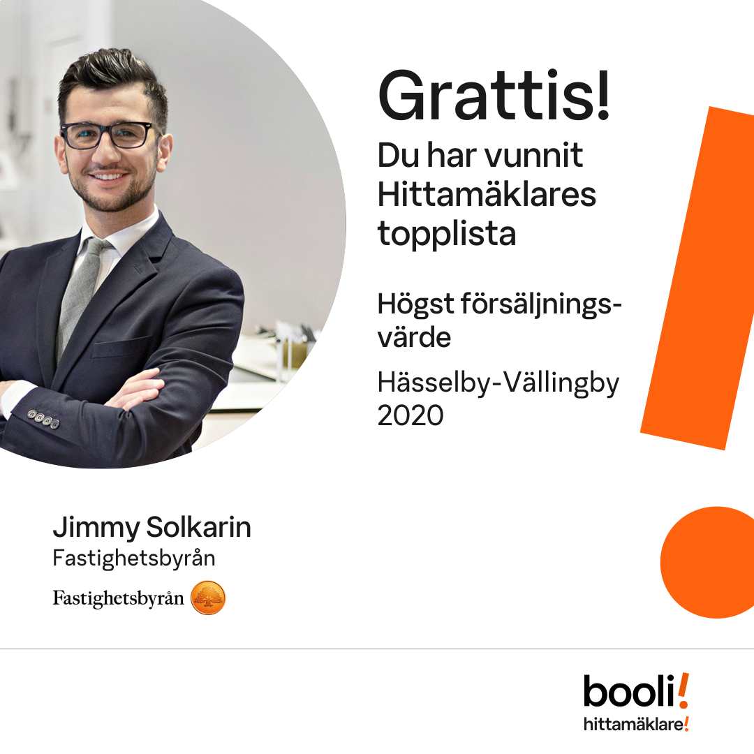 Statistik för publicerade bostäder, försäljningar och omdömen baseras på data från Booli och Hittamäklare. Statistiken för försäljningar avser inrapporterade och verifierade slutpriser från mäklare eller av Booli inhämtade och verifierade slutpriser. Statistiken för publicerade bostäder baseras på information som publicerats på Booli.se. Statistik för omdömen och rekommendationer baseras på omdömen från säljare som lämnats via Booli och Hittamäklare.
